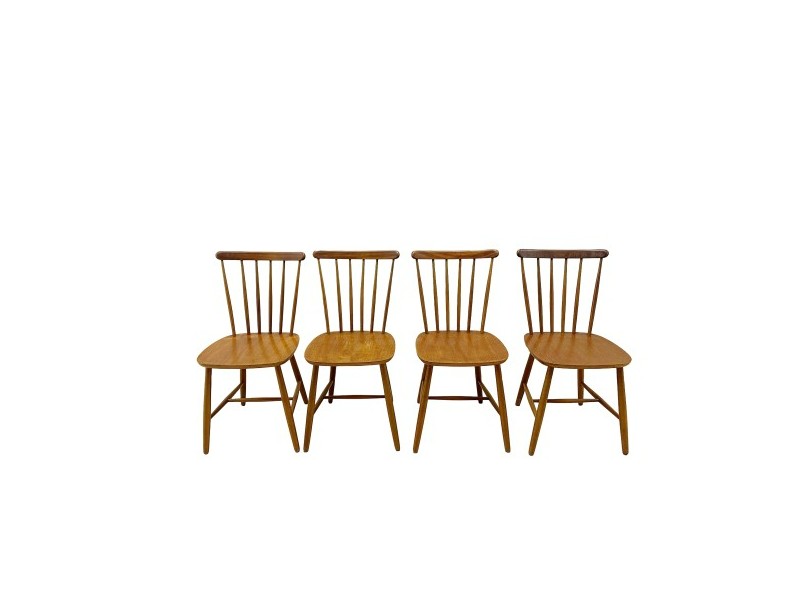 SET OF FOUR VINTAGE 1960’S TEAK SPINDLE BACK CHAIRS, ‘H” STRETCHERS TO UNDERSIDE – 15.75 X 15.75 X 32.5″ H – SEAT – 17.25″ H